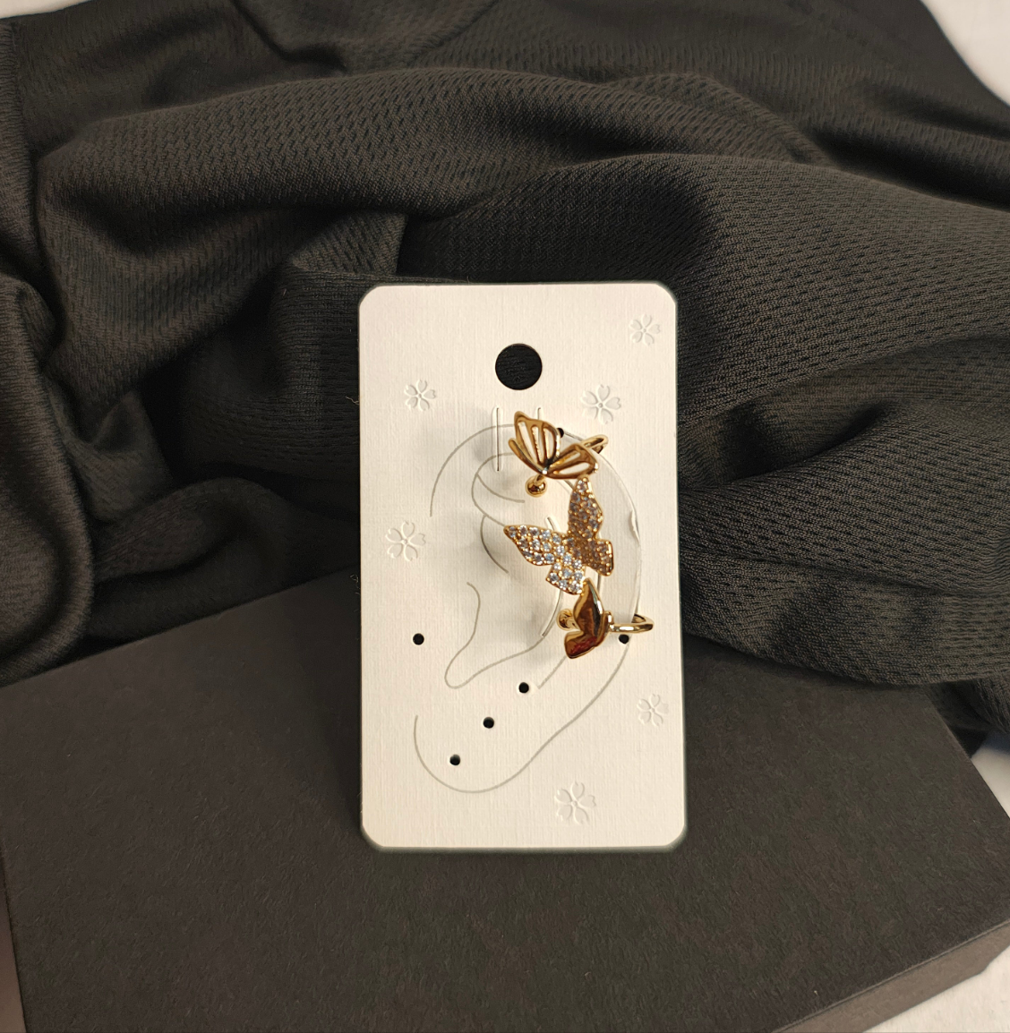 The ear cuffs are gold with butterfly designs. The butterfly bodies have Ad diamons, adding a touch of sparkle.