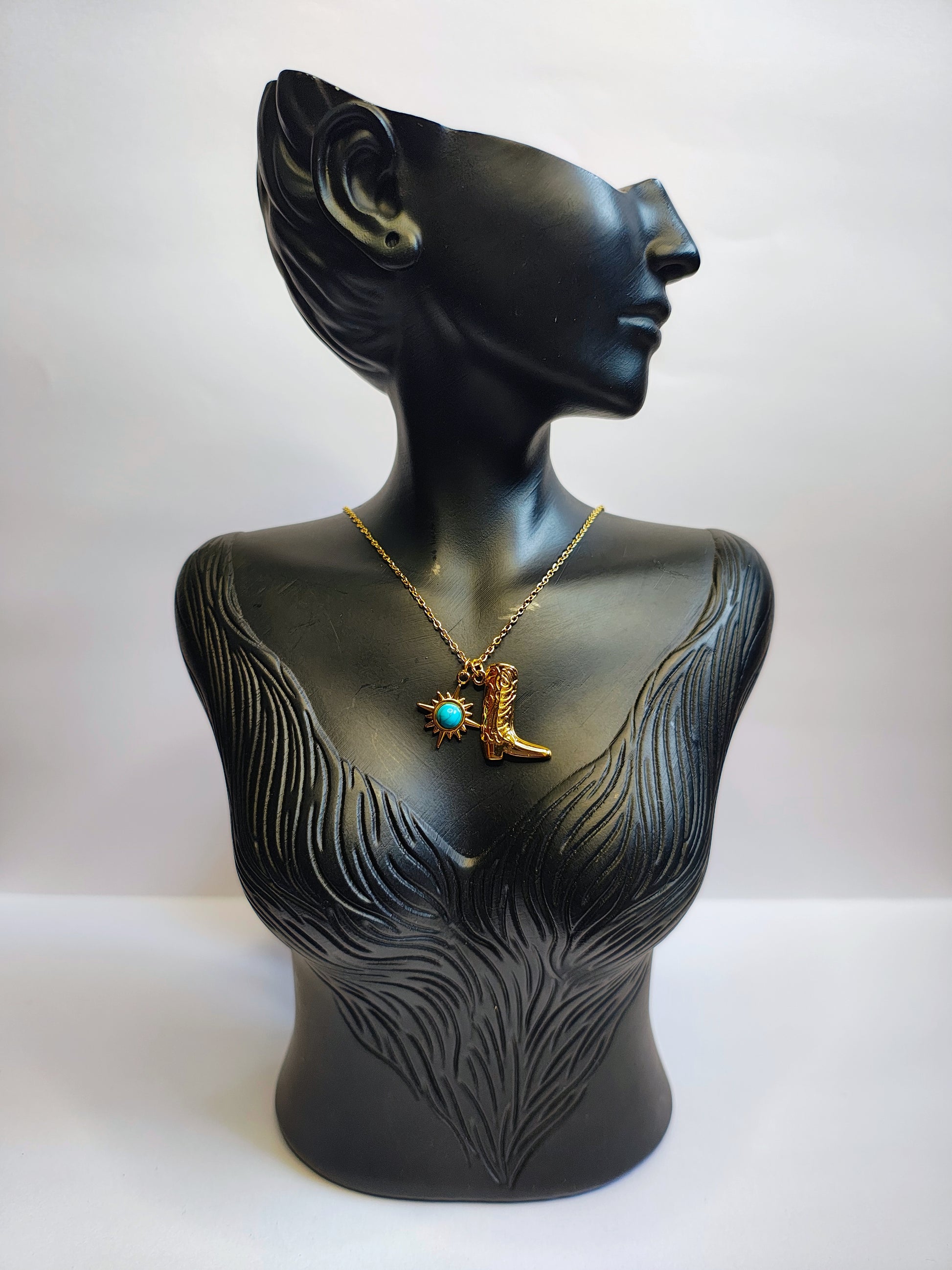 Stand out with this Cowgirl Sun Necklace featuring a golden cowgirl boot charm paired with a radiant turquoise sun pendant. Perfect for those who love bold, boho, and western-inspired jewellery. Lightweight yet stylish, it's a unique piece to elevate your everyday look or gifting collection.