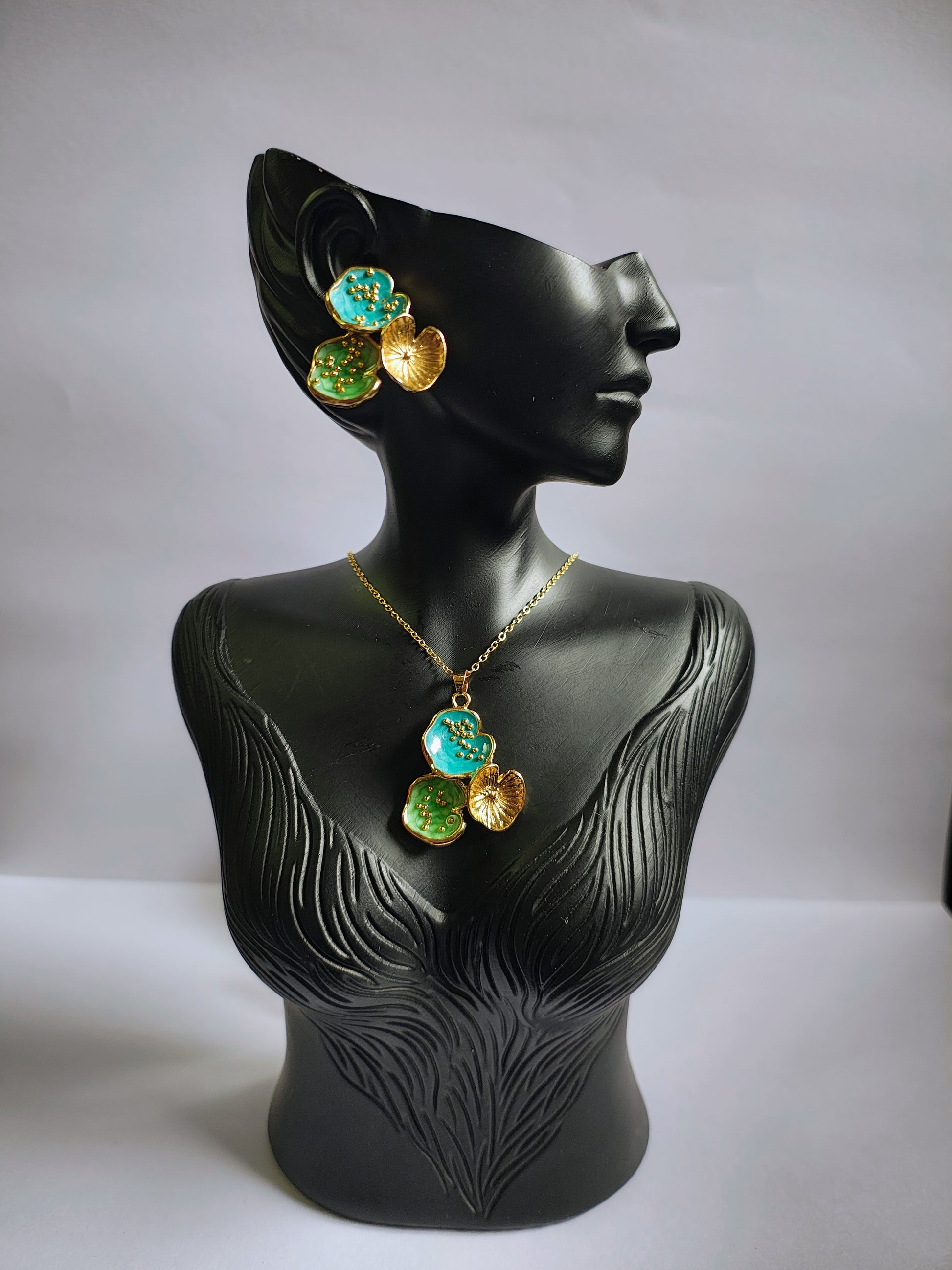 Step into grace with the Emerald Blossom Featuring a matching necklace and earrings with floral motifs in rich green enamel and golden accents, this set is the perfect blend of freshness and elegance. A timeless choice for festive occasions, parties, or gifting someone. special
