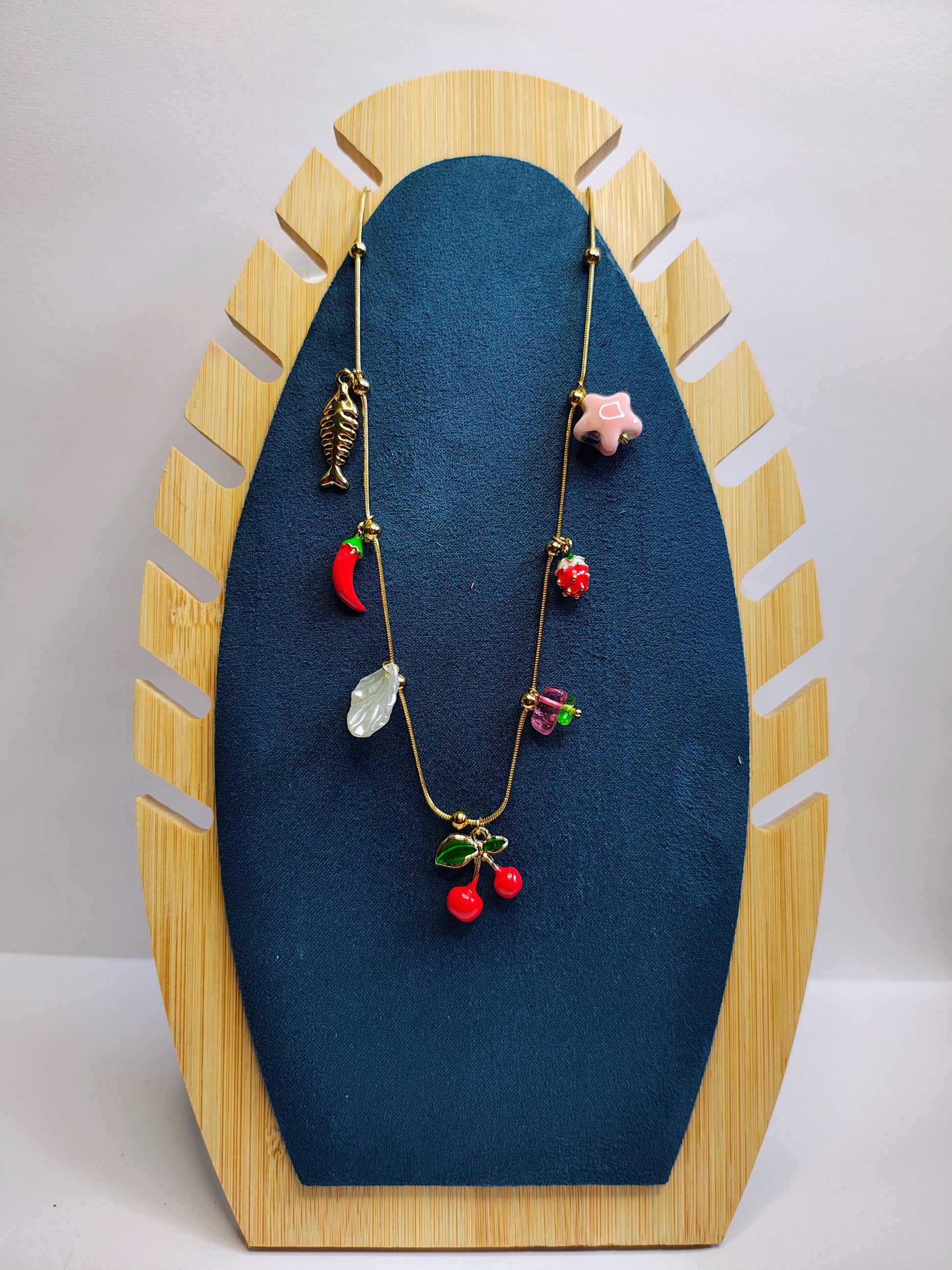 Stand out with this Funky Multi-Charm Necklace featuring a playful mix of charms cherry, strawberry, chili, fish bone, flower, grape, and more! Perfect for those who love to keep their style bold, fun, and unique. Lightweight and versatile, it's an instant mood-lifter and a great gifting pick for quirky jewellery lovers.