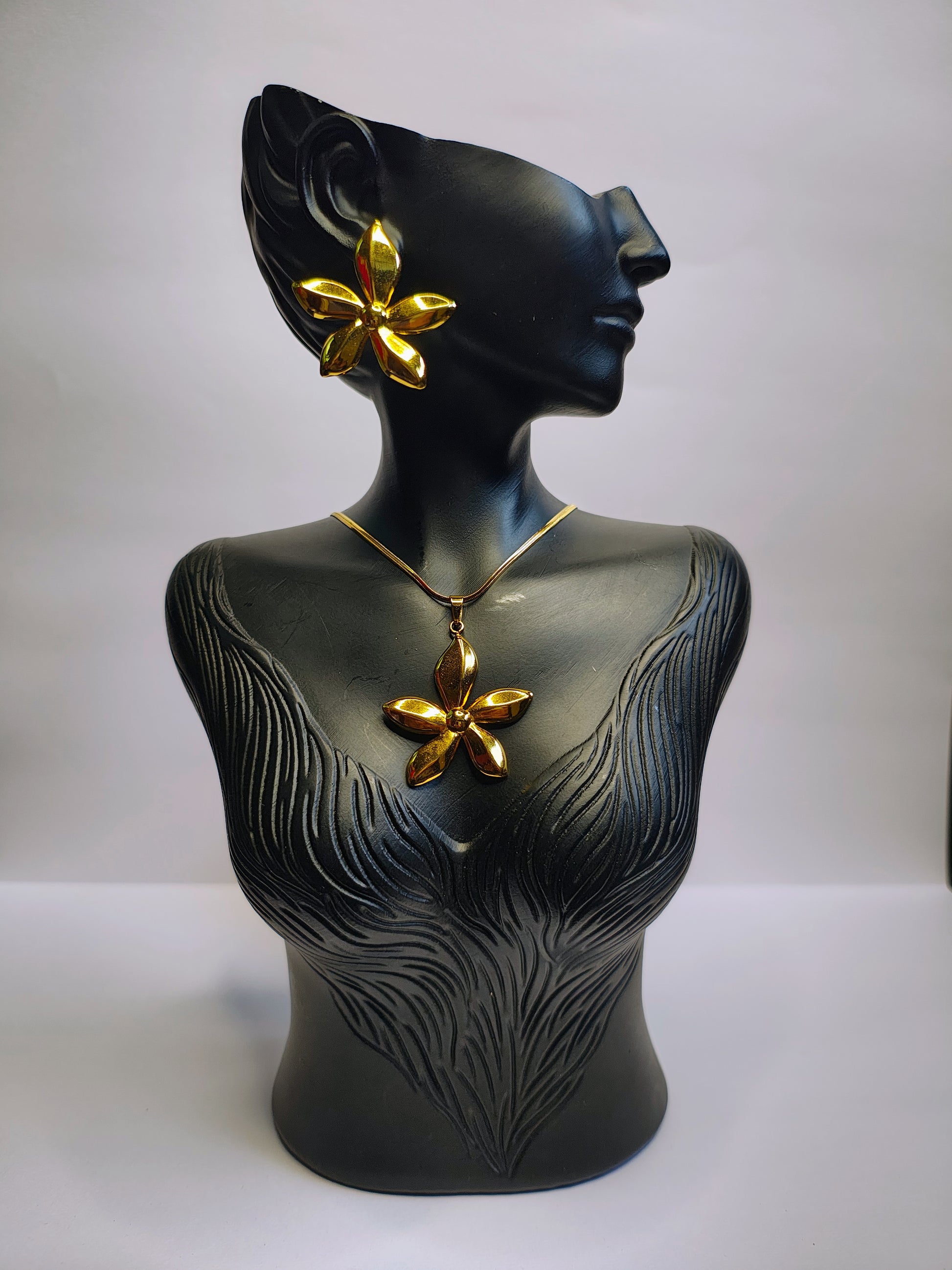 Bloom with elegance in the Golden Flower Jewellery Set. Featuring a matching necklace and earrings with delicate floral motifs and golden accents, this set captures the beauty of nature in a graceful design. Perfect for festive occasions, parties, or gifting someone special-versatile piece that never goes out of style.