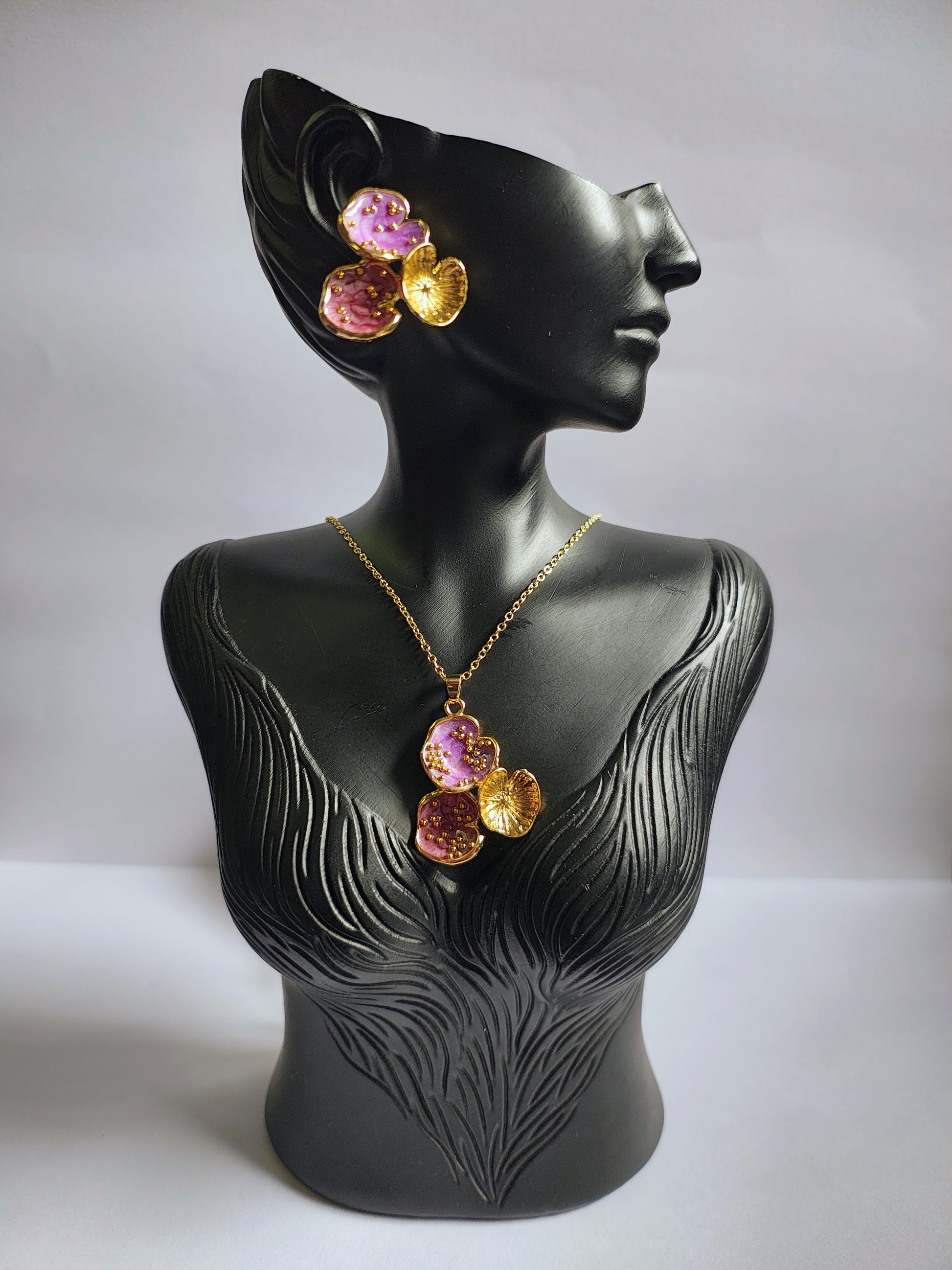 Embrace elegance with the Lavender Blossom Featuring a matching necklace and earrings with floral motifs in lavender-pink enamel and golden accents, this set beautifully balances charm and sophistication. A versatile pick for parties, festive occasions, or gifting someone special.