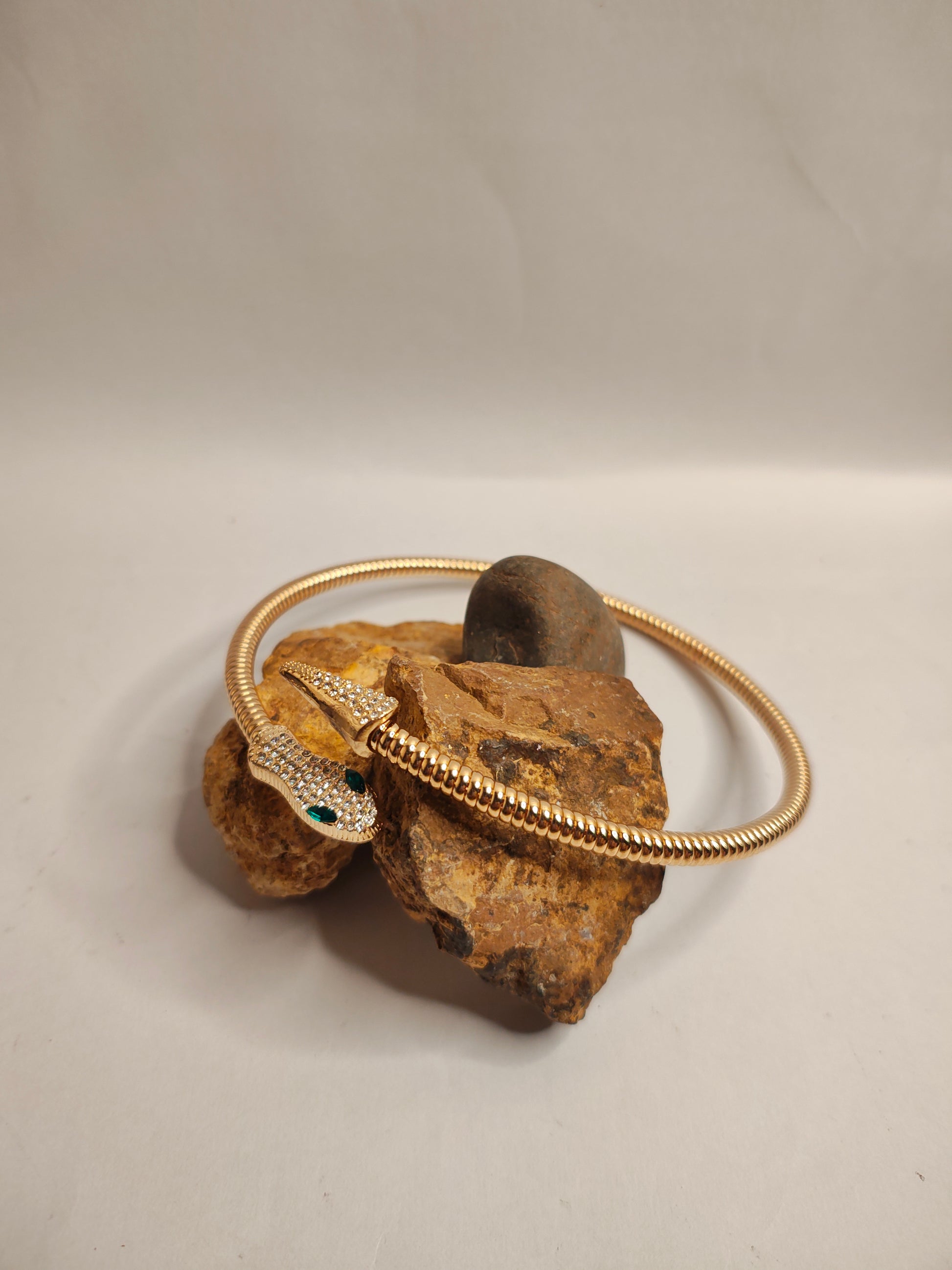 A striking snake-inspired neck cuff that rests boldly at the collarbone. With its sleek, sculpted design, it embodies power, mystery, and elegance perfect for making a fierce statement.